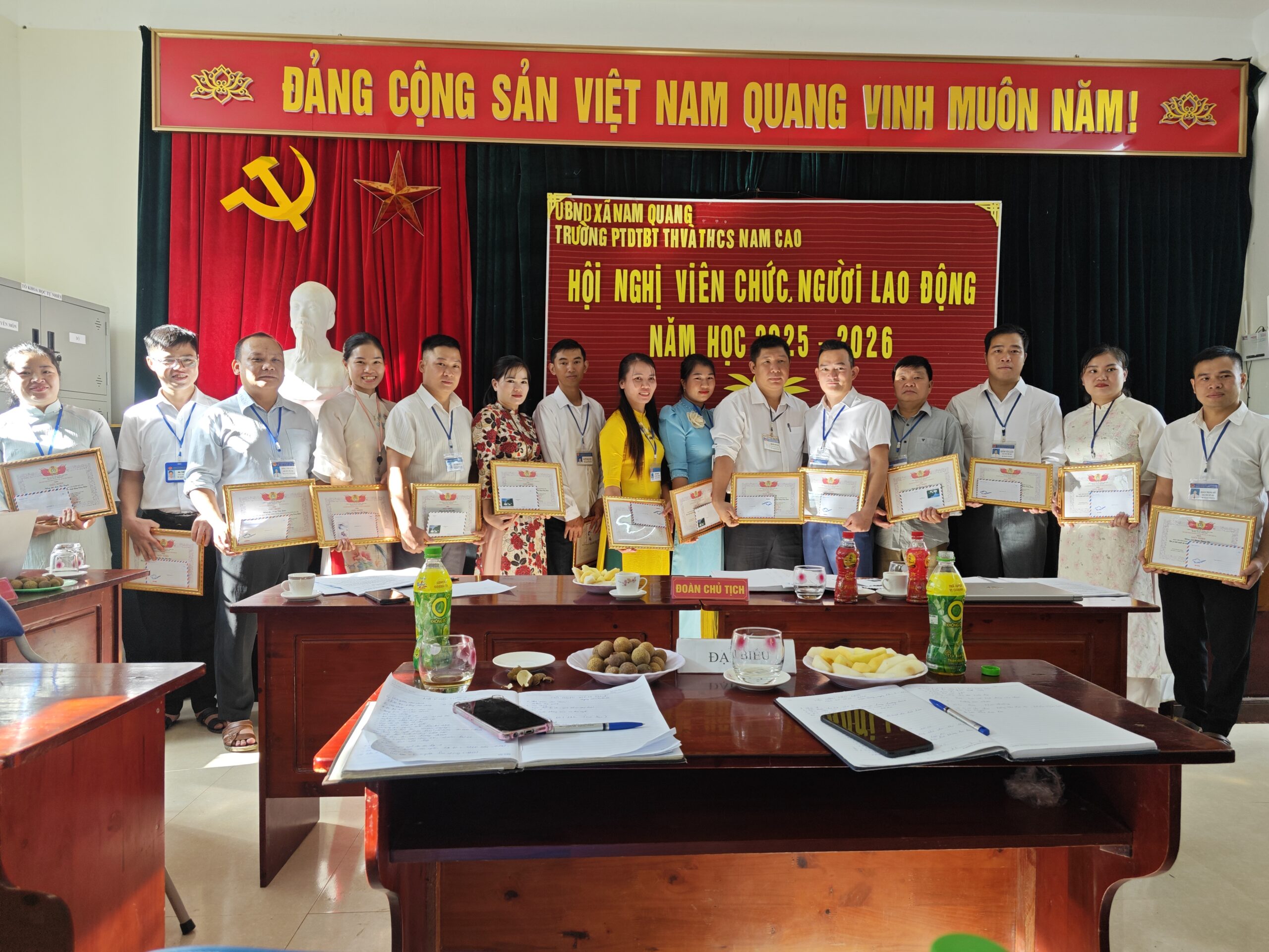 Hội nghị viên chức, người lao động Trường PTDTBT TH&THCS Nam Cao đã thành công tốt đẹp,kết thúc hội nghị, toàn thể viên chức, người lao động của trường PTDTBT TH&THCS Nam Cao đã thống nhất cao với các chỉ tiêu, kế hoạch đề ra cho năm học 2025 – 2026, quyết tâm hoàn thành tốt nhiệm vụ, góp phần nâng cao sự nghiệp giáo dục.