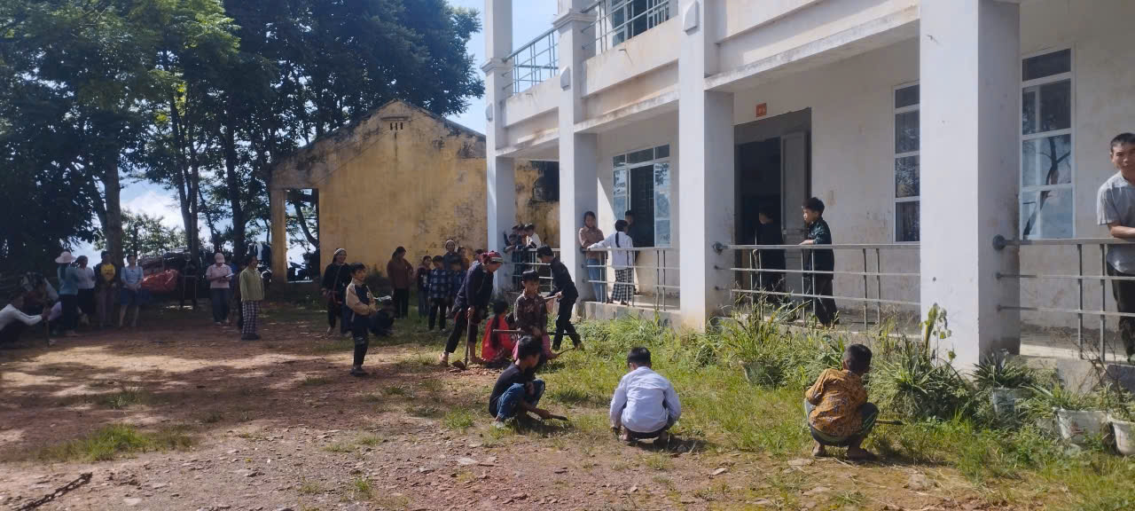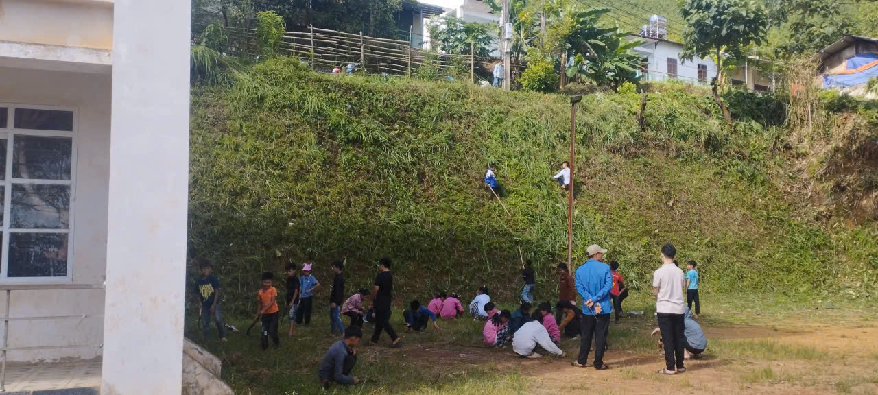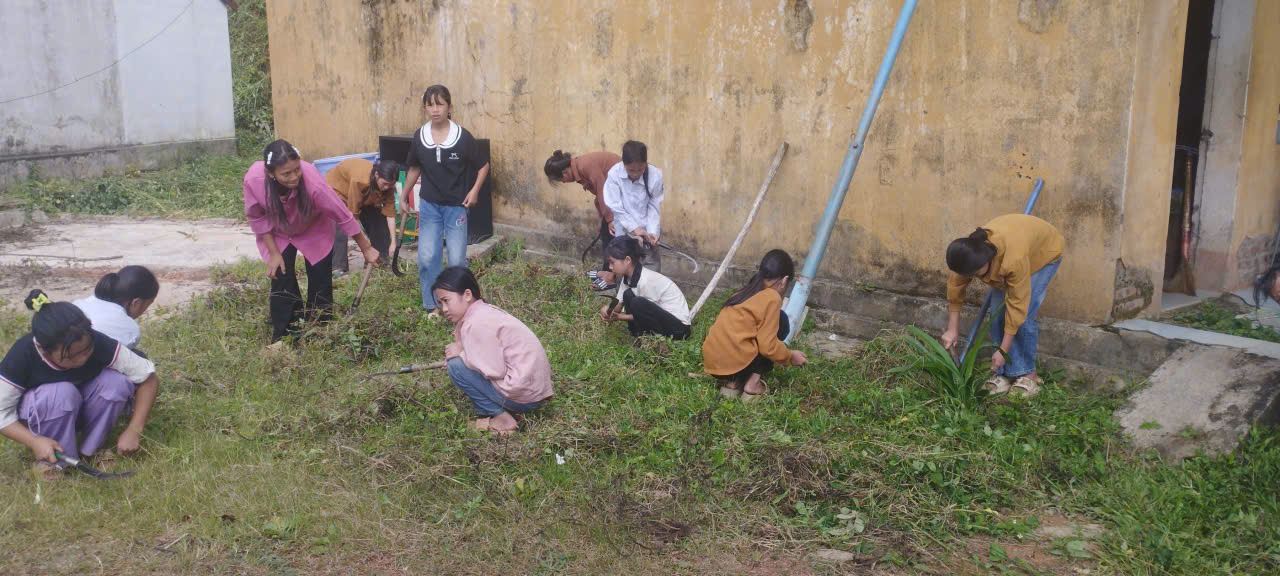 Từng nhóm học sinh chăm chỉ nhổ cỏ, quét dọn sân trường, phát quang bụi rậm và sắp xếp lại khuôn viên sạch sẽ.