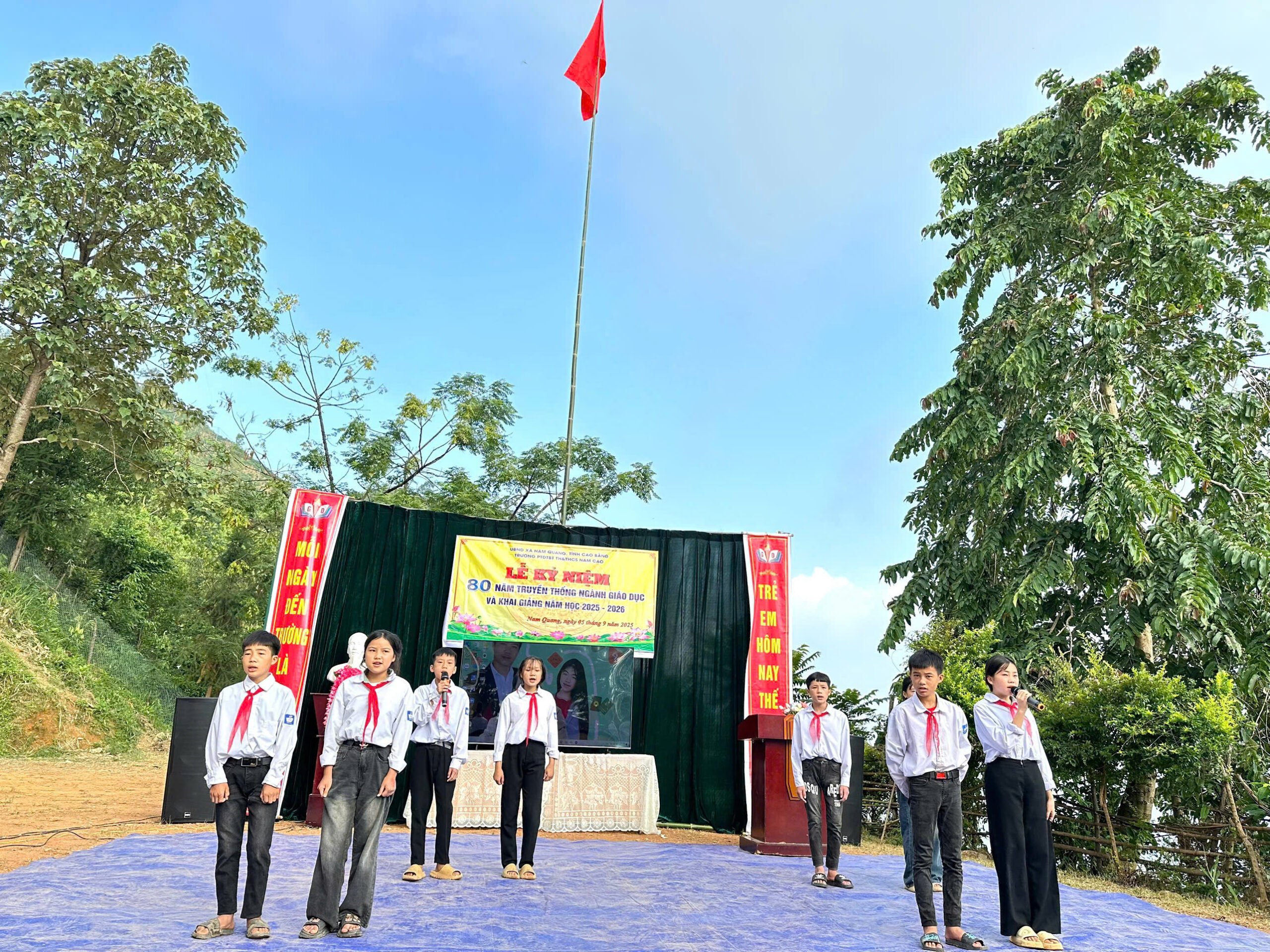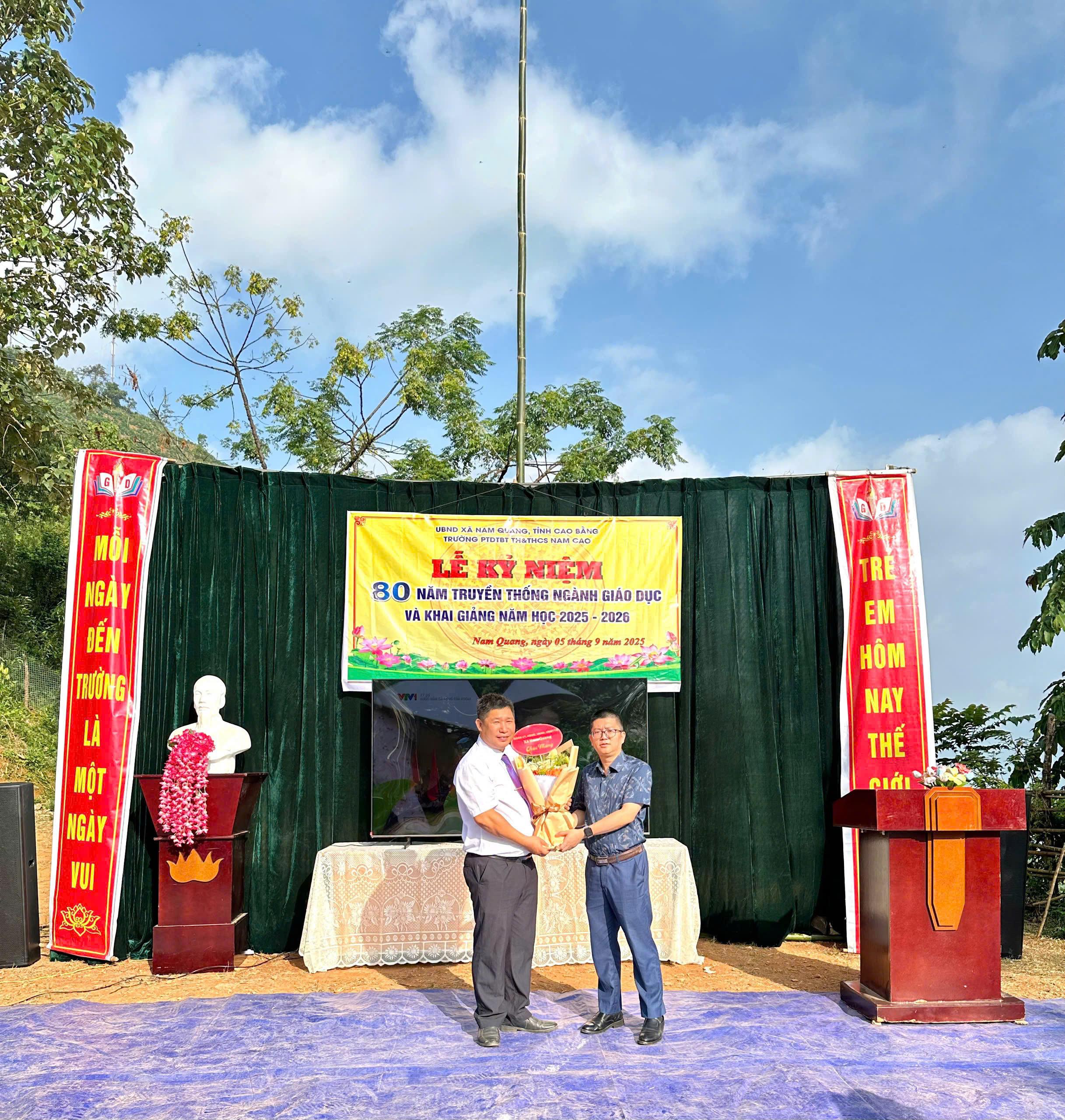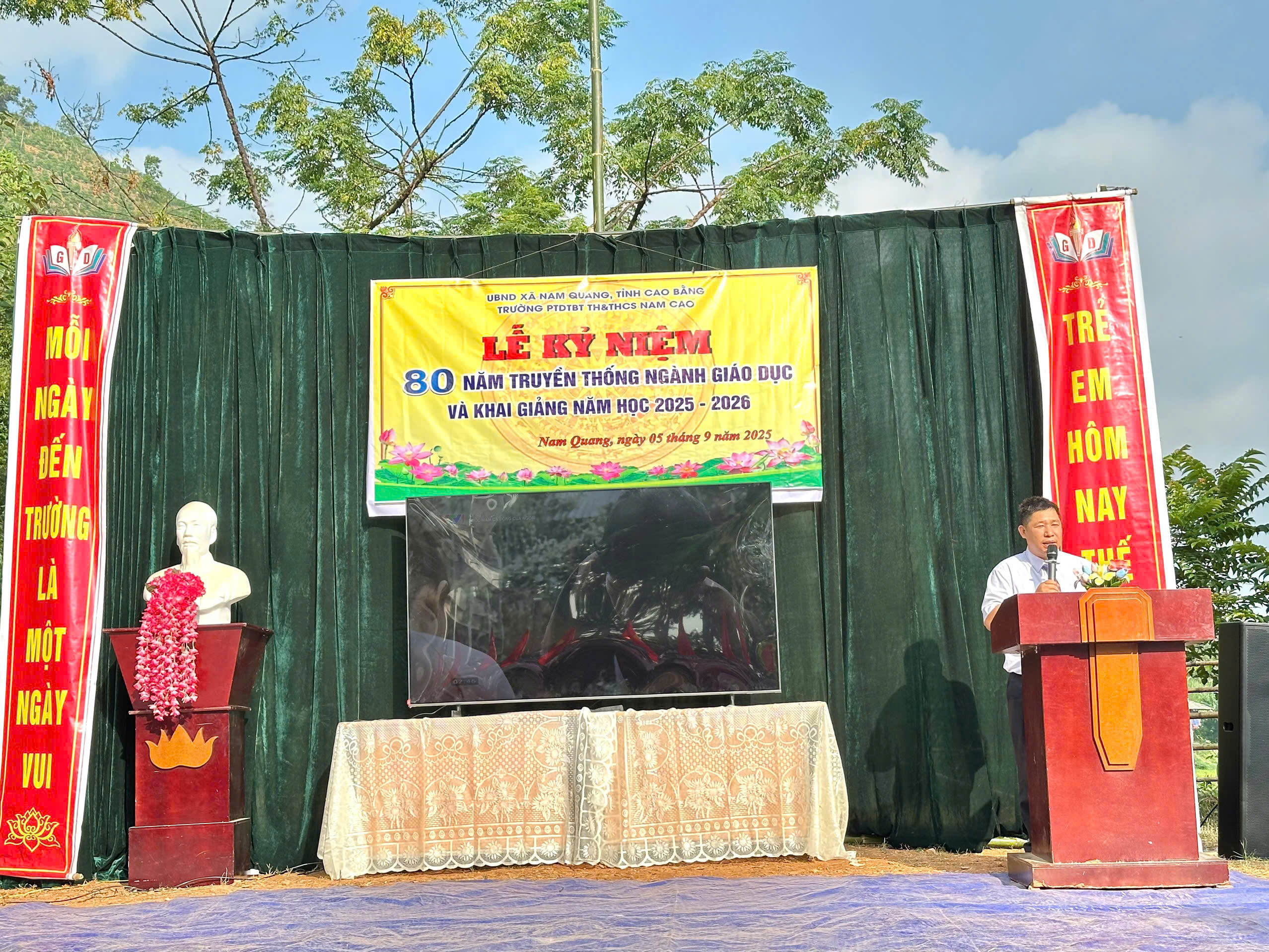 Lễ khai giảng năm nay vinh dự cho nhà trường được tổ chức trong sự quan tâm của Đảng, chính quyền địa phương đến dự và chung vui với nhà trường. Xin cảm ơn các quý vị đại biểu đại diện cho Đảng ủy, HĐND-UBND Xã Nam Quang, công an xã, bưu điện, đại diện xóm Phia Cọ, Ban đại diện CMHS……. sự có mặt của quý đại biểu không chỉ là nguồn động viên to lớn đối với thầy và trò mà còn là sự quan tâm sâu sắc đối với sự nghiệp giáo dục xã nhà là kim chỉ nam để thầy và trò nhà trường tiếp tục phấn đấu, quyết tâm thực hiện thắng lợi nhiệm vụ năm học 2025 – 2026. Xin kính chúc quý đại biểu sức khỏe dồi dào, hạnh phúc, thành công và luôn đồng hành cùng sự nghiệp giáo dục của địa phương.